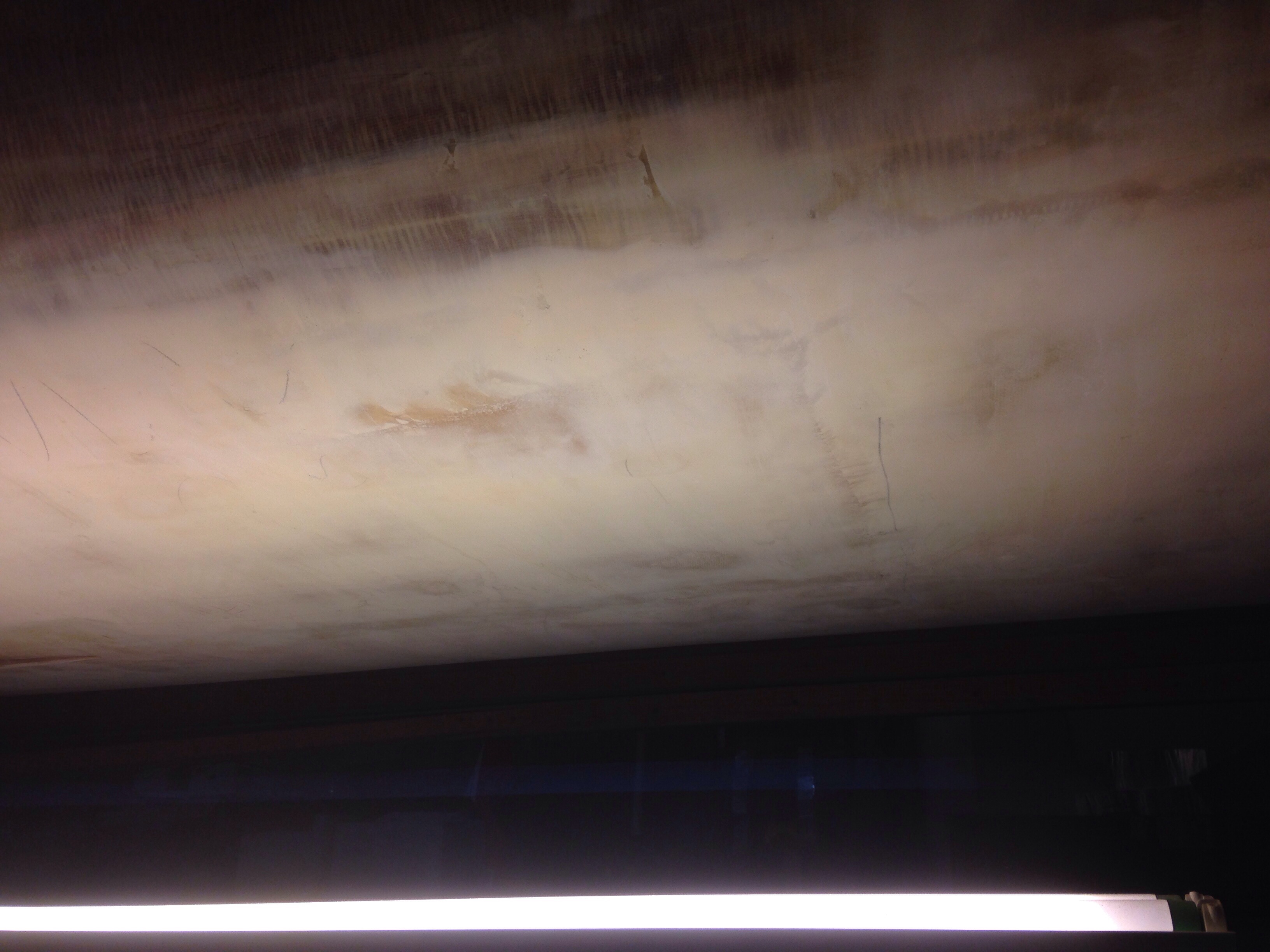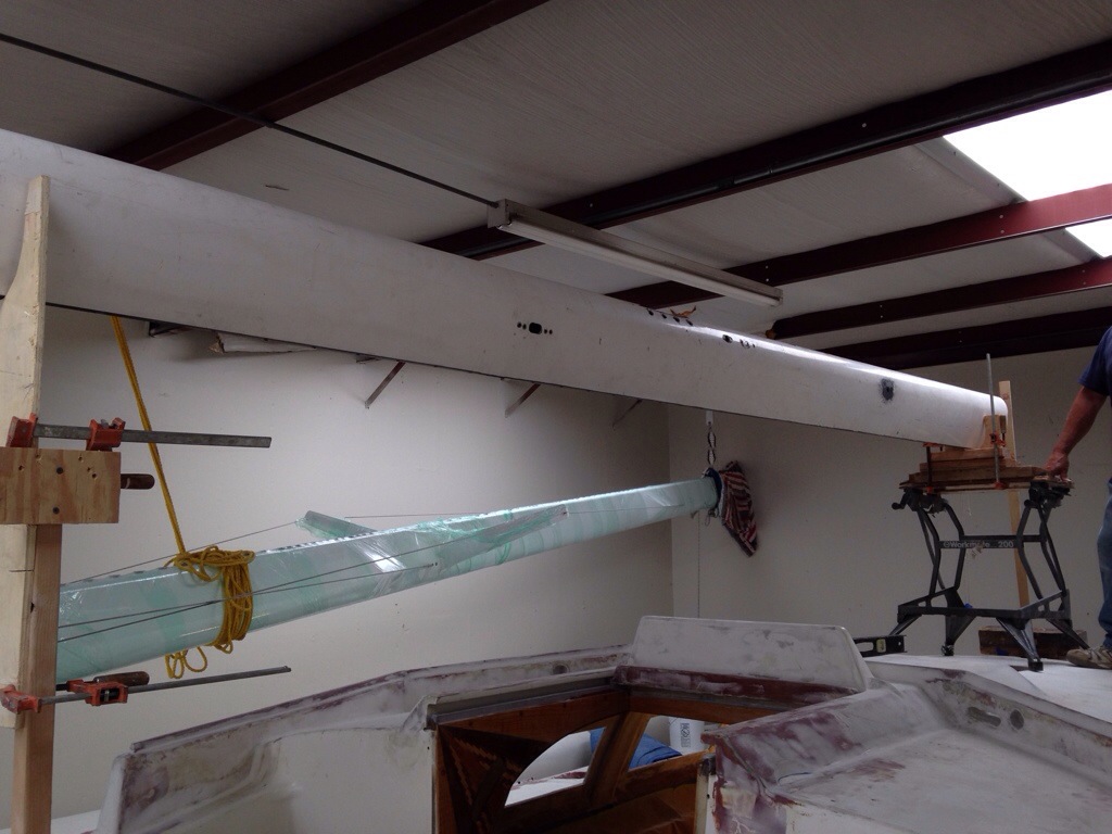 Then the fglass was wetted out on the table and rolled up like little pillsbury crescent rolls (sans hot dogs, Mom) and walked over to the boat after sitting under warming lights for about 20 mins to get tacky (sticky). Here that is with peel ply to help hold it up. Note that it won’t adhere yet to the underside – gravity wins.