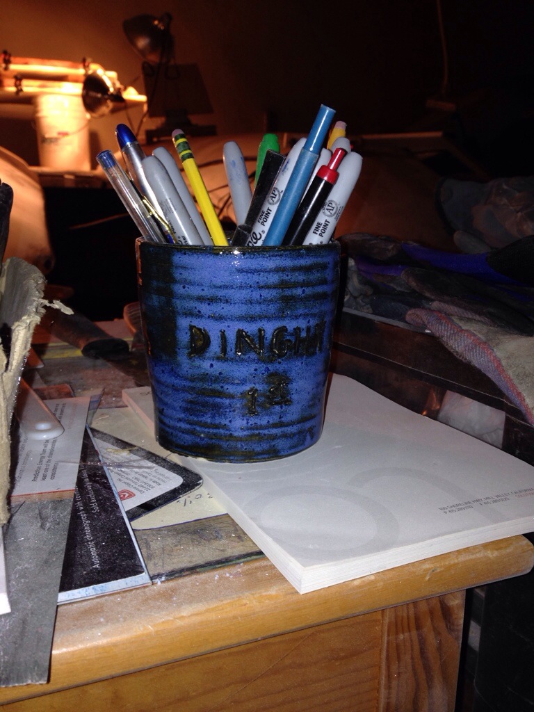Sunday afternoon was spent preparing the 186′ of six-inch wide 18oz fglass fabric needed to create these lashing anchors. That’s 31′ along the hull x three layers x port/starboard, plus all the vac bagging materials. After ten minutes of scissor-burning wrist work, it was a run back home to grab Jeanne’s fabric cutting board and rotary cutting wheel. That helped a bunch, and it was returned in time for tomorrow’s prom dress sewing.